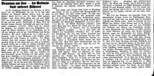 "In der Salzburger-Vorstadt von Braunau, in einem Haus, das ein Arkadenhof, wie wir sie in den alten Städten der Ostmark oftmals finden, ziert, ist unser Führer Adolf Hitler am 20.April 1889 geboren worden. Sein Vater Alois Hitler war seit dem Jahre 1871 als österreichischer Zollbeamter in Braunau tätig. Er hat also den großen Stadtbrand im März 1874, der 800.000 Gulden Schaden verursachte und auch das Stadtarchiv vernichtete, miterlebt. Bald nach der Geburt des Führers, des jüngsten unter den Geschwistern, verzogen die Eltern allerdings in die Linzerstraße, wo sie mit den Kindern auch bis zur Uebersiedlung nach Passau verblieben. Bei einem Zollbeamten ist es nicht zu verwundern, wenn er seine Wohnorte rasch wechselt. Jeder Staatsbeamte weiß darüber zu berichten. Der Bauer vielleicht, kann das weniger begreifen, da es für ihn geradezu Gesetz ist, sich wenig oder gar nicht zu verändern. Dennoch dürfen wir es nicht als zufällig betrachten, daß Adolf Hitler Braunau zur Geburtsstadt hat. Am besten hat er das selbst ausgesprochen. Sein grundlegendes Werk "Mein Kampf" beginnt folgend: "Als glückliche Bestimmung gilt es mir heute, daß das Schicksal mir zum Geburtsort gerade Braunau am Inn zuwies. Liegt doch dieses Städtchen an der Grenze jener zwei deutschen Staaten, deren Wiedervereinigung mindestens uns Jüngeren als eine mit allen Mitteln durchzuführende Lebensaufgabe gilt." Er sah sich durch seine Vaterstadt in seinem Handeln bestimmt und wenn wir diese Einstellung auf die Ereignisse des vergangenen Jahres beziehen,so müssen wir wirklich erkennen, daß hier eine höhere Macht mit dem Sohn der ehemaligen Grenzstadt verbunden war, sobald er nur sinnfällig erkannt hatte, warum er gerade in Braunau und nirgends anderswo geboren werden mußte.