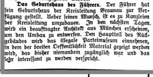 "Das Geburtshaus des Führers. Der Führer hat sein Geburtshaus der Kreisleitung Braunau zur Verfügung gestellt. Über seinem Wunsch, ist es zu Kanzleien der Kreisleitung umzubauen. In den nächsten Tagen wird ein beauftragter Architekt aus München erscheinen, um den Umbau zu entwerfen. Den Hauptteil des Rückgebäudes wird das illegale Parteimuseum einnehmen, in dem der breiten Öffentlichkeit Material gezeigt werden wird, das bisher niemandem zugänglich war und das sehr interessant zu werden verspricht."