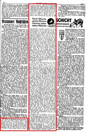 "Braunau lehnt die Ernennung Hitlers zum Ehrenbürger ab. Am 18. April wurde in der Rechtssektion des Braunauer Gemeindeausschusses der großdeutsche Antrag auf Ernennung Hitlers zum Ehrenbürger der Stadt behandelt. Für den Antrag stimmten zwei Großdeutsche und ein Nationalsozialist, dagegen zwei Christlichsoziale und zwei Sozialdemokraten. Somit war die Ehrenbürgerernennung in der Sektion abgelehnt. Nun wird sich noch der Gemeindeausschuß damit zu befassen haben."